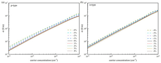 Conductivity σ as a function of carrier concentration for SnSe at 300 K under strain modulation: (a) p-type SnSe and (b) n-type SnSe.