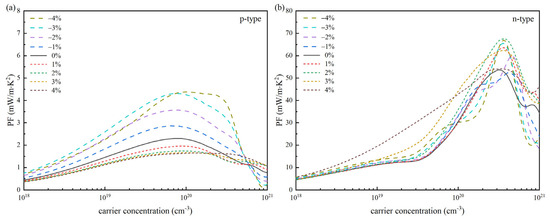 To carry out a more thorough and precise analysis of the electrical transport properties of SnSe, we computed its PF at 300 K and obtained a curve that depicts its relationship with carrier concentration (see Figure 5). For p-type SnSe, compressive strain markedly boosts the PF across a given carrier concentration range. Under the regulation of strain, the maximum power factor (PFmax) is increased from the original 2.3 mW·m−1·K−2 to about 4.3 mW·m−1·K−2, with an increase of about 87%. For n-type SnSe, both compressive and tensile strain can significantly enhance its PF. Especially under the tensile strain of 2%, PFmax increased significantly from 53.6 mW·m−1·K−2 to about 67.6 mW·m−1·K−2, which increased by 26%. Therefore, SnSe in its n-type form demonstrates superior electrical transport properties. These results demonstrate that strain regulation can effectively enhance its electrical transport properties.