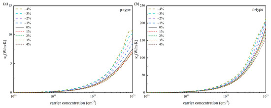 To more precisely determine the ZT of SnSe material, the impact of strain on its heat transport characteristics must be considered, which mainly involves electronic thermal conductivity (κe) and lattice thermal conductivity (κι). The correlation between κe and σ follows the Wiedemann-Franz law [52,54,55], and the expression is: , where the Lorentz constant L is 2.4 × 108 W·Ω·K−2. Figure 6 shows the change in κe relative to carrier concentration at 300 K. The findings indicate that as carrier concentration increases, so does the electronic thermal conductivity, which increases rapidly, accelerating significantly above 1020 cm−3. Therefore, it is expected to obtain the optimal ZT value for carrier concentrations not exceeding 1020 cm−3. Since κe is linearly related to σ, strain impacts κe in a manner analogous to that on σ (see Figure 4).