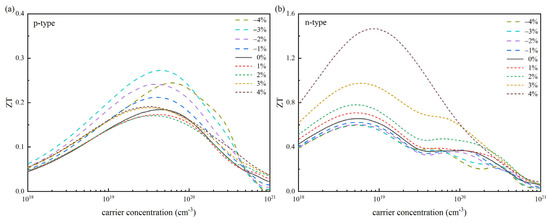 The change in the figure of merit (ZT) of SnSe with carrier concentration at 300 K under strain regulation: (a) p-type SnSe and (b) n-type SnSe.
