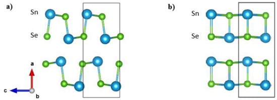Crystal structures of SnSe in Pnma (a) and Cmcm (b) phases. Sn atoms are blue, and Se atoms are green. Cmcm crystal axes are chosen to match the Pnma phase.