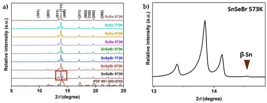 (a) Room-temperature XRD patterns of powder-sample SnSe and Br-doped SnSe (SnSe0.9Br) with a literature comparison []. (b) Close-up (Red box) of the β-Sn peak for a Br-doped sample sintered at 573 K (SnSeBr 573K). The number after each sample name is the sintering temperature.
