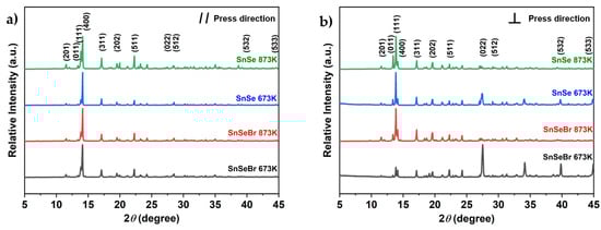 Powder XRD is performed to ensure that an orthorhombic Pnma phase is obtained during synthesis. The resulting X-ray pattern shown in Figure 2 (full pattern in the Supplementary Materials, Figure S2) matches those reported in the literature [], indicating that the chosen synthesis route was successful. Since an anisotropic ordering of the material was expected due to the use of SPS, the obtained samples had to be examined in different sample orientations. The reflection patterns show differences in intensities, indicating a microstructural anisotropy (Figure 3). The obtained samples were labelled according to their chemical composition and sintering temperatures. Undoped p-type SnSe samples were labelled “SnSe”, and n-type SnSe0.9Br0.1-based samples were called “SnSeBr”. The temperature stated afterwards refers to the sintering temperature in the SPS.