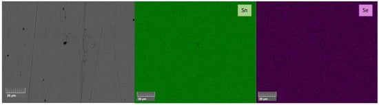 From the XRD patterns, it can be confirmed that a Pnma SnSe structure was obtained. However, all the SnSe0.9Br0.1-based samples showed a metallic tin secondary phase. All undoped SnSe samples did not show any secondary phase impurities in the XRD spectra. For further phase purity and elemental distribution analysis, SEM combined with EDX mapping was employed. Figure 4 and Figure 5 show the backscattered electron images and the elemental maps of the pure SnSe and Br-doped SnSe samples that were sintered at 753/773 K, just below the phase transition. For undoped SnSe, a uniform elemental distribution is shown with no visible phase segregation (Figure 4), whereas in Br-doped SnSe, pure tin secondary phases were found (Figure 5).