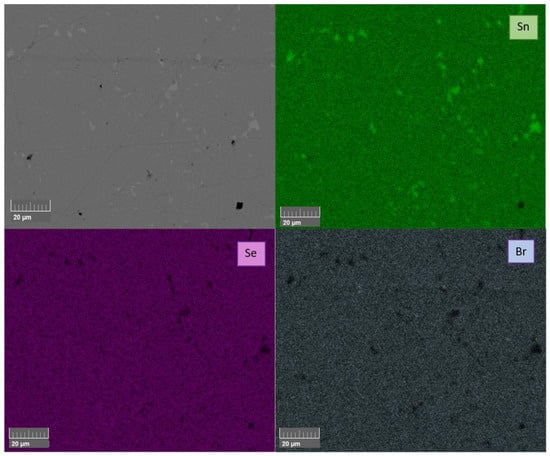 Table 1 summarises the actual chemical composition of all the prepared samples. The actual composition resulted from the average of three different point EDX scans. The results show that the actual composition deviated from the nominal composition in a lack of tin and thus an excess of Se. Moreover, the amount of Br found in the samples was less than expected. The shown lack of Sn can lead to improved TE properties, as was shown by Wei et al. [].