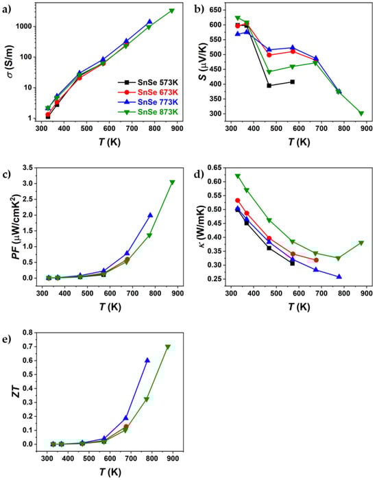 Temperature dependence of (a) electrical conductivity, (b) Seebeck coefficient, (c) power factor, (d) thermal conductivity, and (e) ZT of pure SnSe sintered at different temperatures. Only the first heating part of the heating–cooling measurements is shown.
