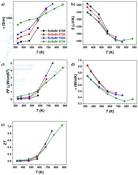 Temperature dependence of (a) electrical conductivity, (b) Seebeck coefficient, (c) power factor, (d) thermal conductivity, and (e) ZT of Br-doped SnSe (SnSe0.9Br), sintered at different temperatures. Only the first heating part of the heating–cooling measurements is shown.