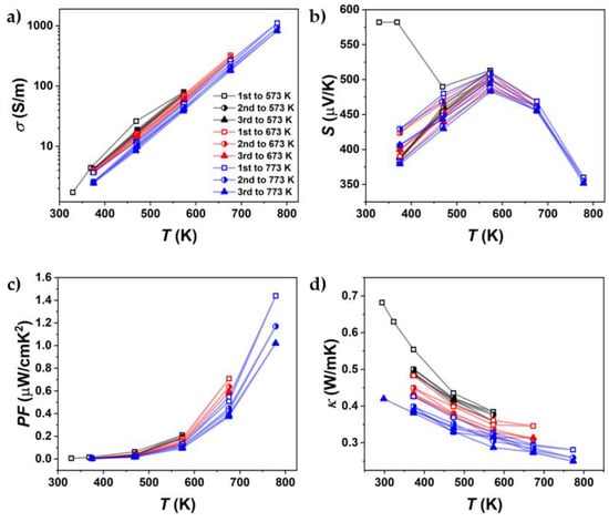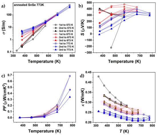 Cycling measurements up to different maximum temperatures of (a) electrical conductivity, (b) Seebeck coefficient, (c) power factor, and (d) thermal conductivity of undoped SnSe, sintered at 773 K (SnSe 773 K).