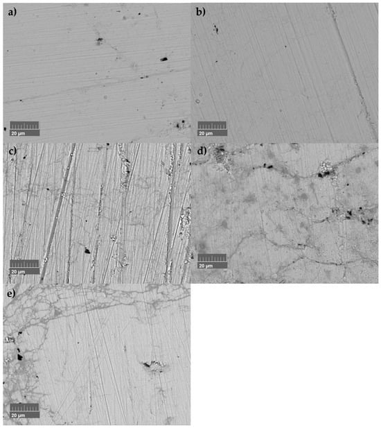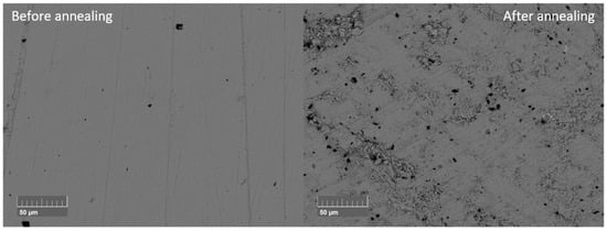 After annealing, all samples still showed the Pnma phase (Supplementary Materials, Figure S10). The Sn secondary phase peak disappeared from the XRD pattern. In the EDX measurements, small Sn secondary phases can be determined. During annealing, Sn beads formed on the sample surface of the SnSe0.9Br0.1-based samples, explaining the reduction in the Sn secondary phase in the matrix (Supplementary Materials, Figure S11). Changes in the main phase composition were not observed. This confirms the previous thermal analysis results, where no evaporation losses were anticipated, at least in undoped SnSe. Additionally, the density decreased for all samples after annealing between 1 and 10% (Supplementary Materials, Table S1). The changes in density were likely due to the increased damage to the microstructure. The damage to the microstructure was also observed in a comparison of BSE images of the same sample (Figure 12) recorded before and after the annealing process. Moreover, annealed samples were more brittle than before, resulting in easier breaking during polishing.