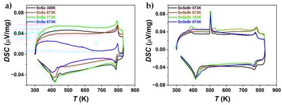 DSC measurements of (a) undoped SnSe and (b) Br-doped SnSe (SnSe0.9Br), sintered at different temperatures. The measurement shows the first heating and cooling cycle of the sample pieces.