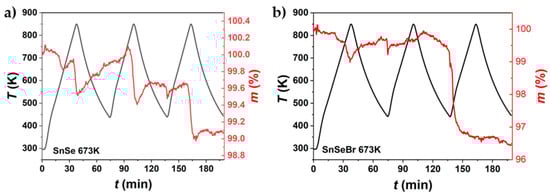 TGA measurement in three heating and cooling cycles of (a) undoped SnSe and (b) Br-doped (SnSe0.9Br), both sintered at 673 K. The samples were not subject to heating–cooling before the TGA measurement.