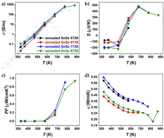 Temperature dependence of (a) electrical conductivity, (b) Seebeck coefficient, (c) power factor, and (d) thermal conductivity of pure SnSe, sintered at different temperatures, where all samples were annealed at 753 K.