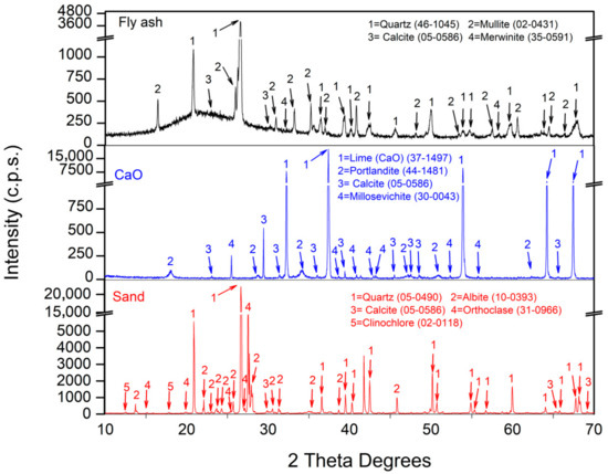 According to the XRD analysis of the raw material (Figure 1), the principal crystalline phase of FA was quartz (SiO2) (46-1045) [49], while another significant aluminosilicate phase was mullite (2(Al2O3) SiO2) (02-0431) [49]. The calcium-containing crystalline phases include calcite (CaCO3) (05-0586) [49] and merwinite (Ca3Mg (Si O2)2) (35-0591) [49]. Similar results have been reported in several FA studies [25,56,57]. As previously mentioned, silica sand was used, with quartz (SiO2) (05-0490) [49] as its main crystalline phase. Additionally, minor crystalline phases were observed, such as calcite (CaCO3) (05-0586) [49], and aluminosilicates, such as orthoclase (KAlSi3O8) (31-0966) [49] and albite (NaAlSi3O8) (10-0393) [49]. In CaO, the dominant peak corresponded to lime (37-1497) [49] with minor peaks of calcium-related minerals including portlandite (Ca(OH)2 (44-1481) [49], calcite (CaCO3) (05-0586) [49] and millosevichite (Al2(SO4)3) (30-0043) [49].