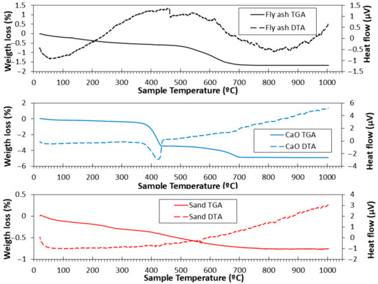 Figure 2 shows the TGA/DTA graphs of FA, CaO, and NS-0/4. For FA, the weight loss gradually increased with temperature. A significant mass loss occurred between 550 °C and 700 °C due to the combustion and oxidation of unburnt coal particles in the FA. Sulphide and iron compounds may also decompose in this temperature range [58]. No appreciable mass loss was observed from 700 °C to 1000 °C, consistent with other studies [56,59]. The DTA curve exhibited an endothermic peak around 460 °C, corresponding to the oxidation and combustion processes detected in the TGA curve [59].