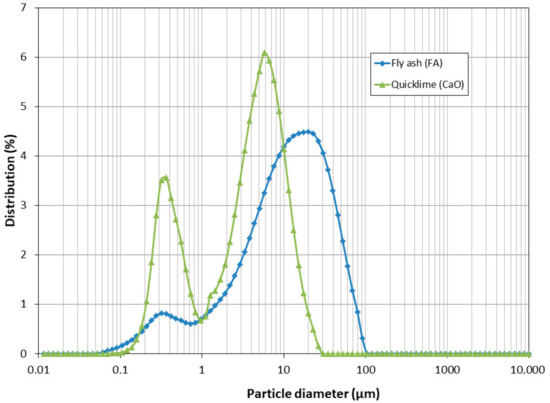 The particle size distribution of FA (Figure 3) shows a main peak at approximately 19 µm and a smaller peak around 0.30 µm, indicating the presence of a significant fraction of very fine particles (category N) [54]. Similar particle size distributions for FA have been reported in other studies [24,25], which allows comparison and verification that the FA characteristics are consistent across different investigations. For CaO, the particle size distribution exhibited a primary peak at approximately 6 µm (60%) and a secondary peak at around 0.35 µm (35%).
