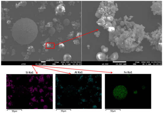 SEM micrographs were obtained to characterise the microstructures of FA and CaO. FA particles exhibited a predominantly spherical morphology (Figure 4), with diameters of approximately 20 µm, consistent with the particle size analysis described previously. EDS mapping confirmed that the main elements were Si, Al, and Fe, in agreement with the XRF results (Table 1). Similar SEM observations have been reported in previous studies [34,56]. CaO particles displayed an irregular morphology (Figure 5), with variable dimensions and shapes, as also noted in other research [59]. EDS analysis indicated that the principal elements were Ca and O, corroborating the XRD and XRF data (Figure 1 and Table 1). The higher porosity and presence of cracks in CaO compared to FA may reduce the workability of the resulting mixtures [61].