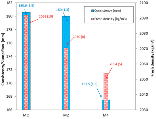 Consistency decreased as the CaO content in the binder increased, following the trend M0 > M2 > M4 (Figure 6). This behaviour is attributed to the irregular shape of CaO particles (Figure 5) compared to the spherical morphology of FA (Figure 4), which increases interparticle friction. Although the reduction in consistency is not very pronounced, the mixture containing 4% CaO becomes unworkable after 5 min. This phenomenon, known in the literature as “fast setting” or “accelerated setting” [43], may be caused by the heat of hydration released by CaO. Additionally, free calcium ions from CaO can react with the silica and alumina in FA, leading to the formation of C-S-H and C-A-S-H phases [43]. The fresh density showed a similar trend to consistency, which can be attributed to the higher Ca/Si ratio and is correlated with the reduced workability of the M2 and M4 mixtures (Figure 6) [23,61,62]. It should also be noted that the density of lime is lower than that of FA (2188 kg/m3 for FA and 1986 kg/m3 for CaO).
