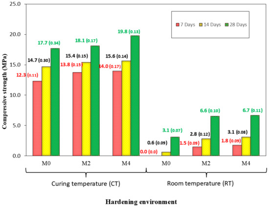 - Curing temperature (CT): Samples were heated at 70 °C for 24 h, then unmoulded and subsequently cured at room temperature until the testing ages (7, 14, and 28 days).