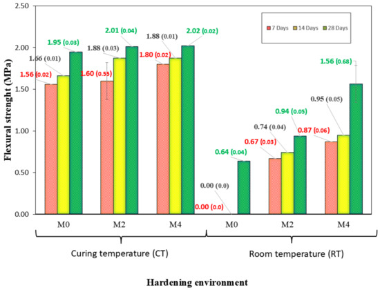 The trend observed for the flexural strength (Figure 8) is the same as that for the compressive strength. It should be noted that for the mix at RT, if it were not for the use of CaO up to the age of 28 d, the samples did not show resistance. This is indicative of the benefits of using CaO in the mixtures studied: using CaO as a “substitute/assistant” for thermal curing in AAMs. No previous studies used mixtures similar to those used in this study. Again, the difference between 2 and 4% for both environments is not very remarkable.