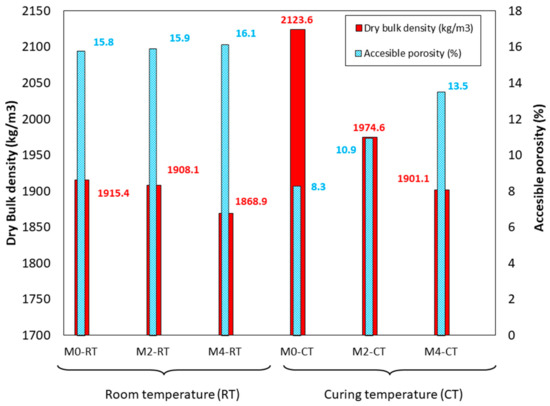 Dry bulk density (kg/m3) and accessible porosity (%). (The deviation was less than 0.1 kg/m3 for density and less than 0.2% for all the measurements).