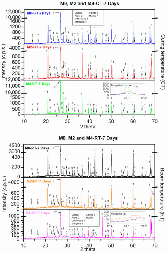 Figure 10 shows the XRD patterns obtained under the two curing environments at 7 d of age. For the reference sample (M0) under CT, the phases observed were quartz (SiO2) (05-0490) [49], albite (NaAlSi3O8) (10-0393) [49], orthoclase (KAlSi3O8) (31-0966) [49], and calcite (CaCO3) from the sand used (Figure 1). Additionally, mullite (2(Al2O3)SiO2) (02-0431) was found [49]. It should also be noted that quartz and mullite were present in FA. The presence of mullite indicates that the alkaline activation process was not completed by 7 days [67]. Additionally, between 25 and 35° 2ϴ, there was a diffuse band, corresponding to the presence of the vitreous phase (CSH gels) [68]. The main crystalline reaction product is margarite (CaAl2(Si2)O10(OH)2) (18-0276) [49]. Similar results were reported by Chi et al. (2013) [69].
