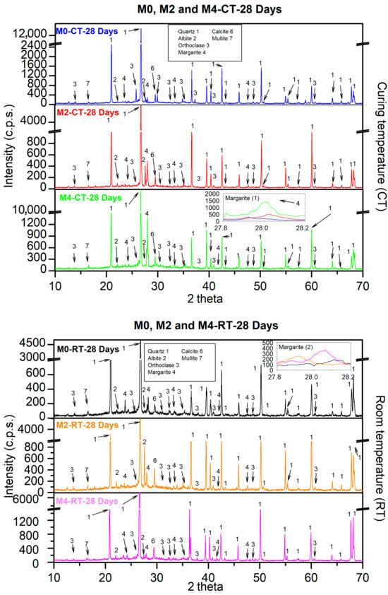 Figure 11 shows the results for XRD patterns obtained under the two curing environments at an age of 28 days. It should be noted that under CT, the crystallinity seems to be somewhat higher, which could be indicative of a more advanced alkaline activation process than that at 7 d [25,67]. This is in accordance with the fact that the mechanical properties improved over time, as shown in Figure 8 and Figure 9. However, mullite was still present, and reactions continued to occur at the age of 28 d. Again, in the inset labelled as “Margarite (1)”, a higher intensity of this phase is observed as the CaO content increases. For CT, the same observations as for the age of 7 d were made. Additionally, there was no clear increase in the formation of margarite as the addition of CaO increased (see inset labelled “Margarite (2)”).