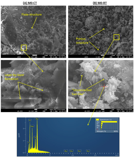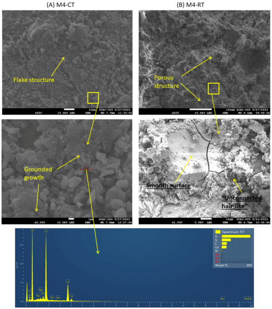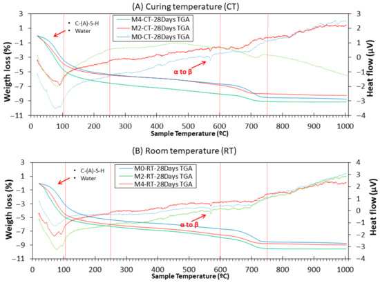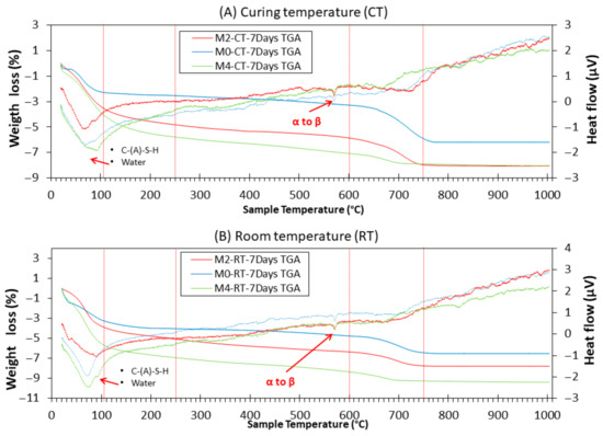 Figure 12 shows the TGA/DTA curves of the M0, M2, and M4 samples after 7 days of CT and RT. Distribution of mass losses corresponding to the composition of hydration products and unhydrated precursors was observed. It should be noted that the comparison of RT and CT samples is made within specific temperature ranges (e.g., <105 °C, 400–500 °C, etc.), which correspond to characteristic decomposition events. Thus, the differences observed reflect the relative evolution of reaction products and bound water content, rather than variations in the initial moisture state of the samples.