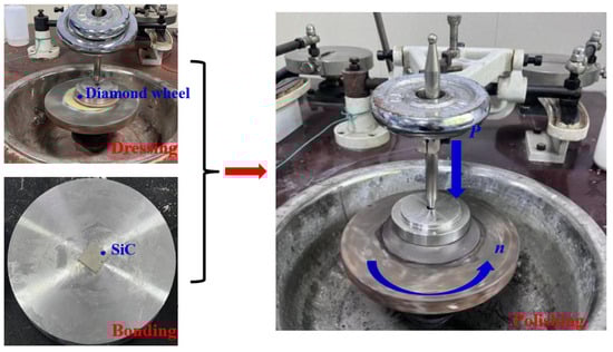 As illustrated in Figure 2, the abrasive tool was conditioned using an electroplated diamond grinding wheel. The 4H-SiC samples (dimensions: 12 mm × 12 mm × 500 μm) were bonded to the polishing fixture using paraffin wax. Polishing experiments were conducted on a polishing machine (xibin opto-electronic Co., Ltd, Wuxi, China) with the following parameters: polishing load of 1 kgf (pressure: 68 KPa), rotational speed of 50 rpm, polishing fluid feed rate of 20 mL/h, and polishing time of 1 h. Three types of polishing experiments including dry, water, and hydrogen peroxide polishing were conducted. Each experiment was repeated three times. In the present experimental study, the polished SiC underwent ultrasonic cleaning using analytical-grade ethanol as the solution. The material removal rate (MRR) was calculated using Formula (1) below, and the mass of the silicon carbide was measured using a high-precision electronic balance (resolution: 0.0001 g). Surface morphology and roughness of the polished silicon carbide were analyzed using a super-depth microscope and a laser interferometer.