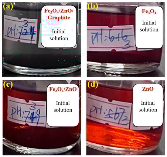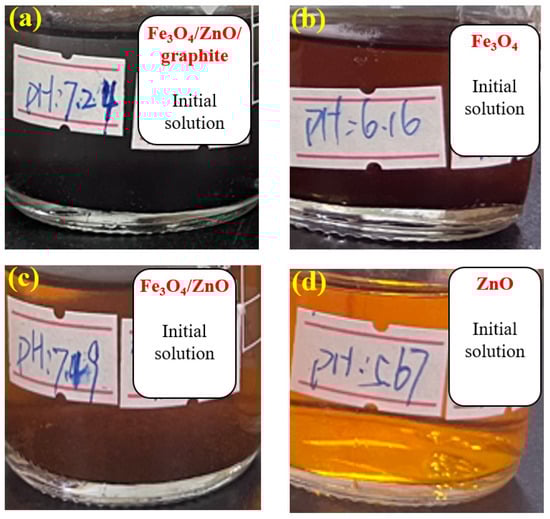Solution colors at pH3: (a) Fe3O4/ZnO/graphite; (b) Fe3O4; (c) Fe3O4/ZnO; (d) ZnO.