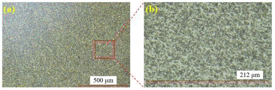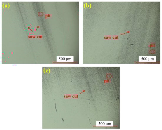 Figure 6 shows the single crystal SiC sample before polishing. Figure 6a displays the surface at 100× magnification, while Figure 6b provides a zoomed-in view of Figure 6a. Through the super-depth microscope (SDM), it is evident that the surface after wire cutting is rough, with numerous brittle pits present.