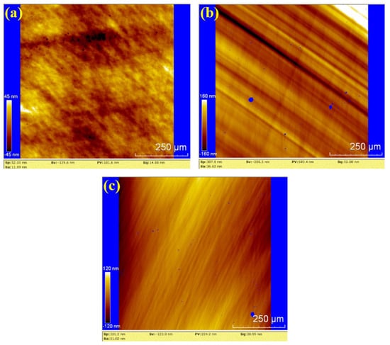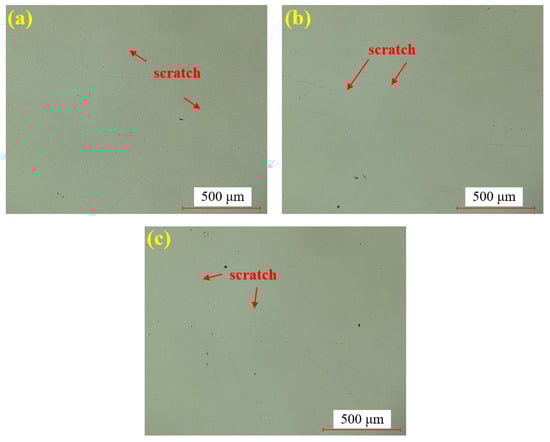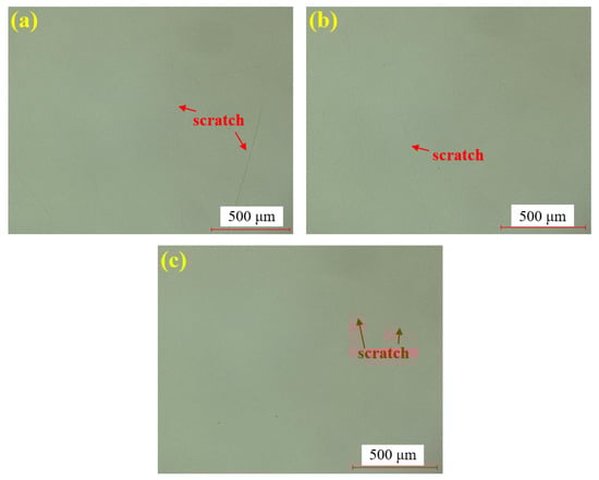 Figure 8 shows the water polishing results of single crystal SiC under the super-depth microscope. Figure 8a–c represents three repeated experiments using the mixed abrasive tool under the same polishing conditions. Compared to the original sample, no brittle scratches are observed on the silicon carbide surface, and the surface roughness is significantly improved. In comparison to the dry-polished samples, the residual saw marks on the silicon carbide surface have been removed. Based on this, it can be preliminarily concluded that the efficiency of water polishing is higher than that of dry polishing.