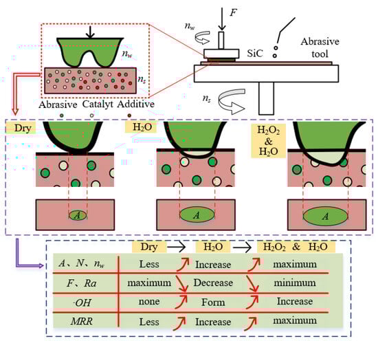 Based on the results and analysis of methyl orange degradation and single crystal silicon carbide polishing, Figure 14 illustrates the mechanism of the mixed catalyst abrasive tool for dry polishing, water polishing, and hydrogen peroxide polishing of single crystal silicon carbide. In dry polishing, the interaction between the silicon carbide micro-protrusions and the abrasive tool is primarily mechanical. In contrast, water polishing and hydrogen peroxide polishing involve chemical reactions, leading to differences in the contact area (A), the number of effective abrasive particles (N), and the force per abrasive particle (F) between the silicon carbide and the abrasive tool. Dry polishing results in a smaller contact area, fewer effective abrasive particles, and a larger force per abrasive particle, which increases the scratch size and reduces the silicon carbide rotational speed (nw), resulting in poor surface quality and a low MRR. In water polishing and hydrogen peroxide polishing, catalytic oxidation reactions occur, increasing the removal efficiency of the silicon carbide micro-protrusions. This leads to an increase in the contact area, the number of effective abrasive particles, and the silicon carbide rotational speed, while reducing the force per abrasive particle. As a result, the material removal rate is higher, and the surface quality is improved. Since hydrogen peroxide enhances catalytic efficiency, the formation rate of ·OH during polishing increases, further improving the oxidation efficiency of SiC. Therefore, hydrogen peroxide polishing exhibits the highest efficiency and the best surface quality.
