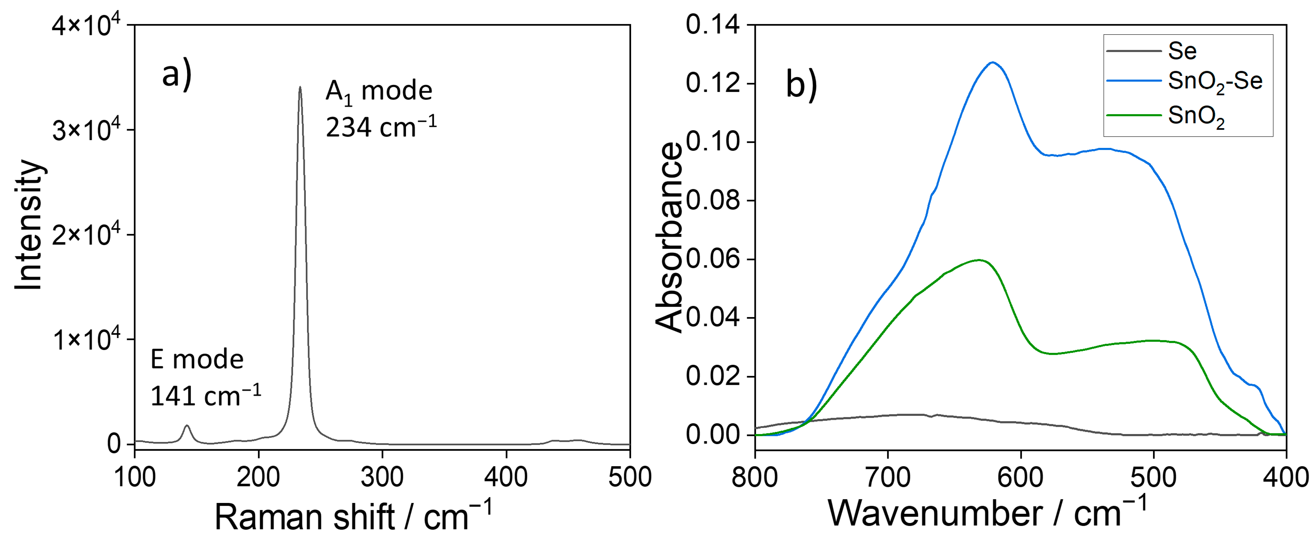 - Wang, Y.; Sun, S. FTIR and Raman spectral analysis of SnO2 and SnO2-based composites. Mater. Sci. Eng. B 2015, 192, 1–8. [Google Scholar] [CrossRef]