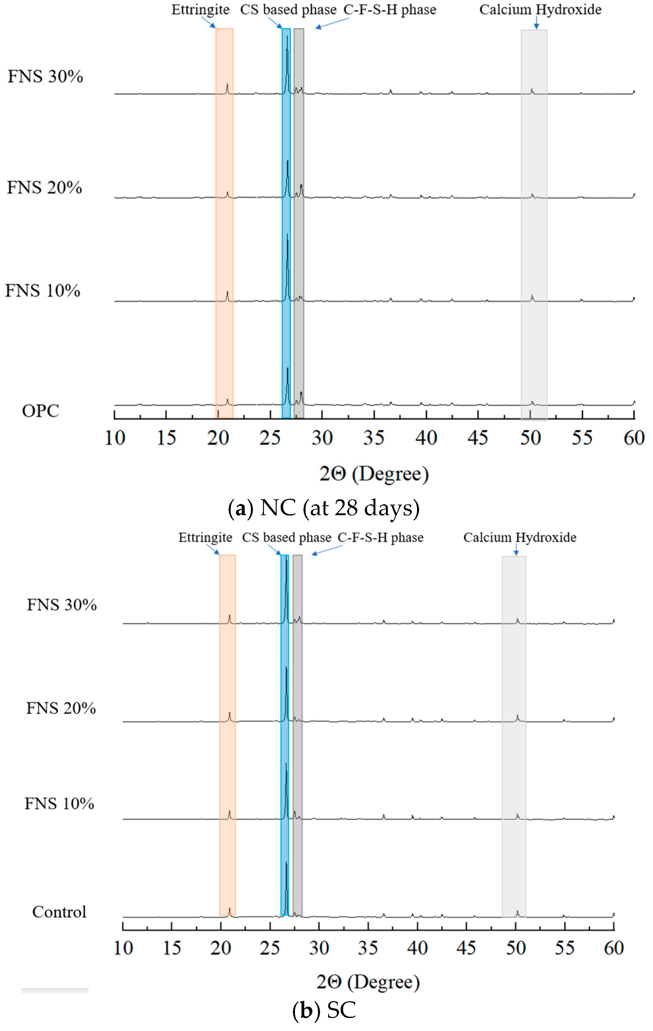 - XRD diffraction analysis showed that the CS-based phase and calcium hydroxide were generally higher under SC for the control, FNS 10%, and FNS 20%, indicating that SC can produce hydration effects comparable to 28-day NC, suggesting that SC can promote hydration and compensate for early-age strength reduction in FNS concrete, making it suitable for precast applications.