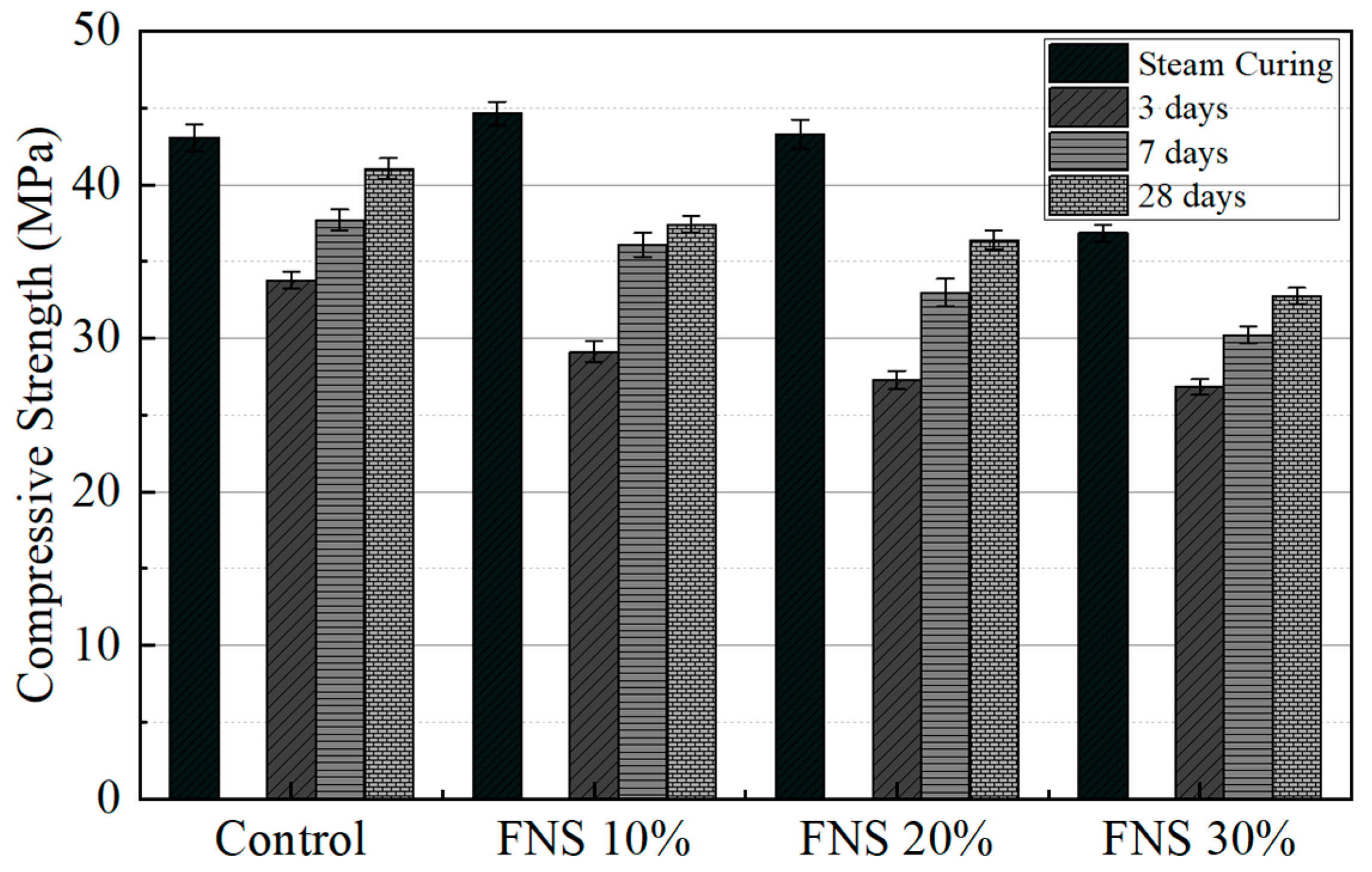4.1. Comparison of Compressive Strength Under Various FNS Replacement Ratios and Curing Methods