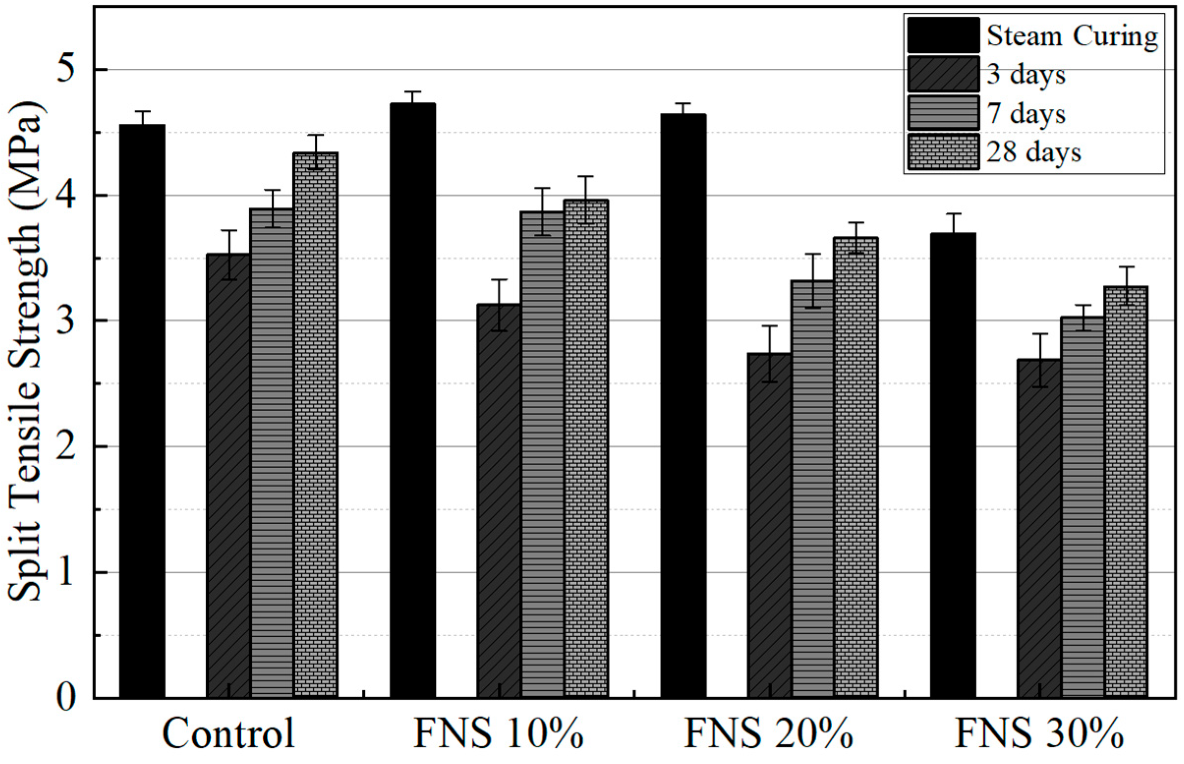 4.2. Comparison of the Split Tensile Strength Under Various FNS Replacement Ratios and Curing Methods