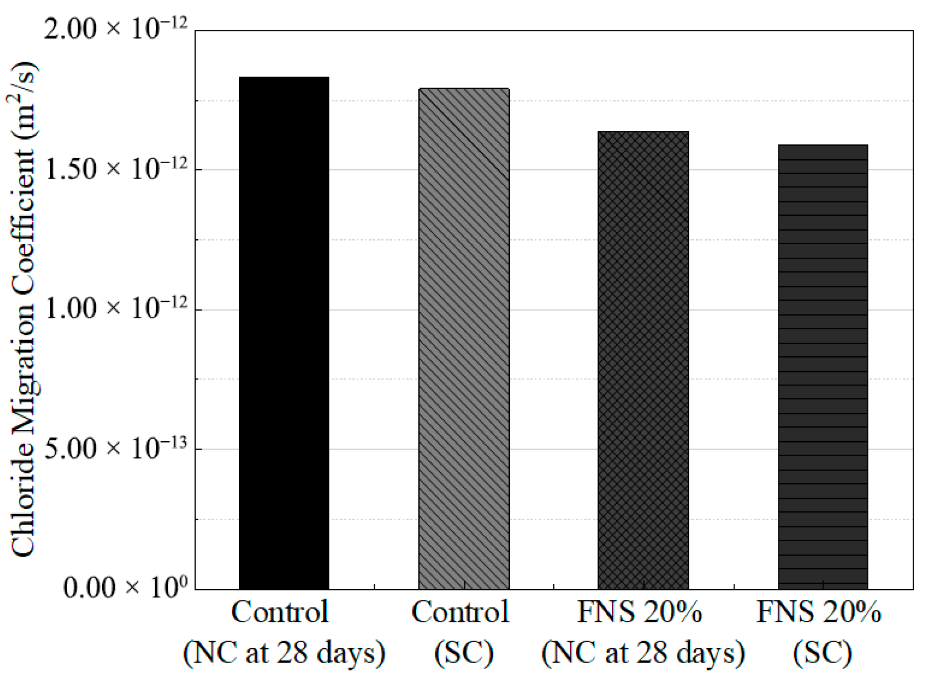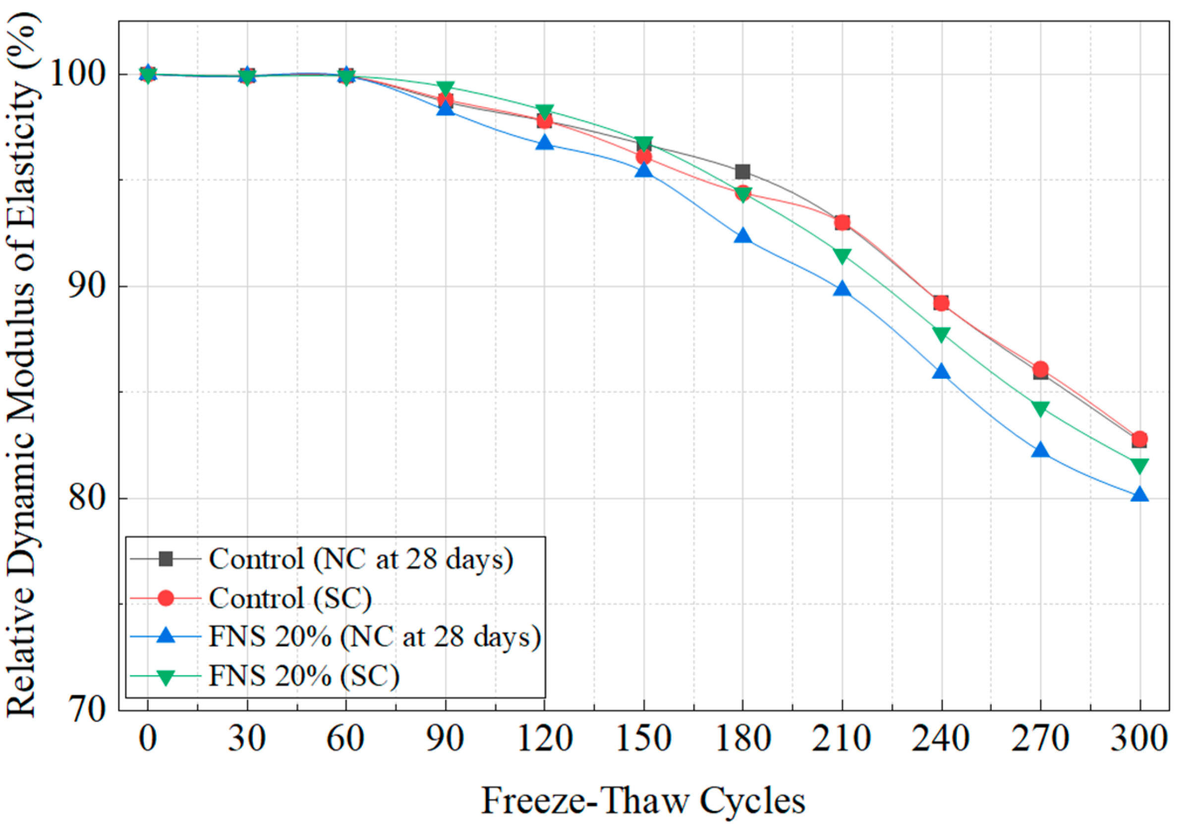- The FNS 20% revealed chloride penetration resistance (≈11% improvement under SC compared to NC) and adequate freeze–thaw durability, maintaining >80% of dynamic modulus after 300 cycles, surpassing the ASTM C666 requirement. Thus, FNS 20% combined with SC is considered an effective mix design for precast concrete applications.