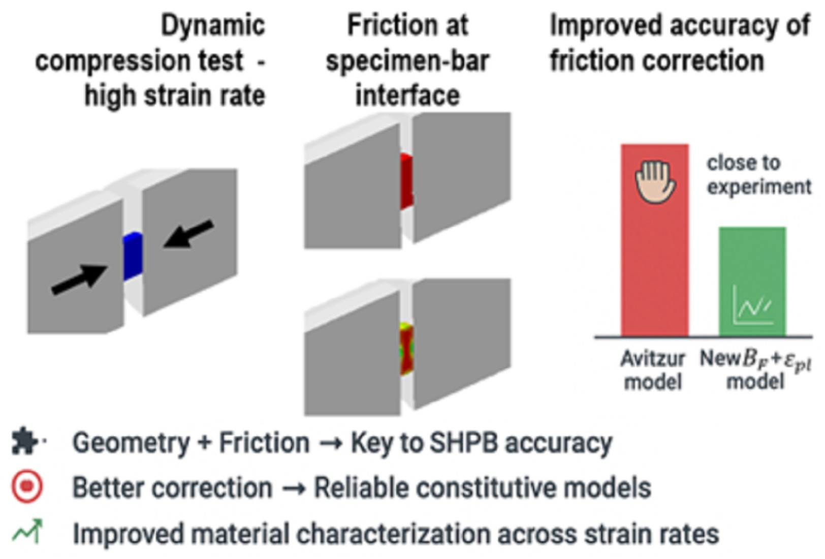 The geometry of the samples, expressed through the height-to-diameter ratio (H/D), was shown to govern the balance between the uniformity of stress and the magnitude of undesirable effects such as radial inertia, barreling, or buckling. Low H/D ratios improve stress homogeneity but increase radial inertia and barreling, while high H/D ratios reduce these effects but increase the risk of axial strain gradients and premature instability. The interaction between geometry and friction further amplifies measurement errors when the boundary conditions are not precisely controlled. Numerical simulations, particularly using Abaqus/Explicit, proved indispensable to identify these coupled effects, improve friction calibration curves, and validate new correction model.