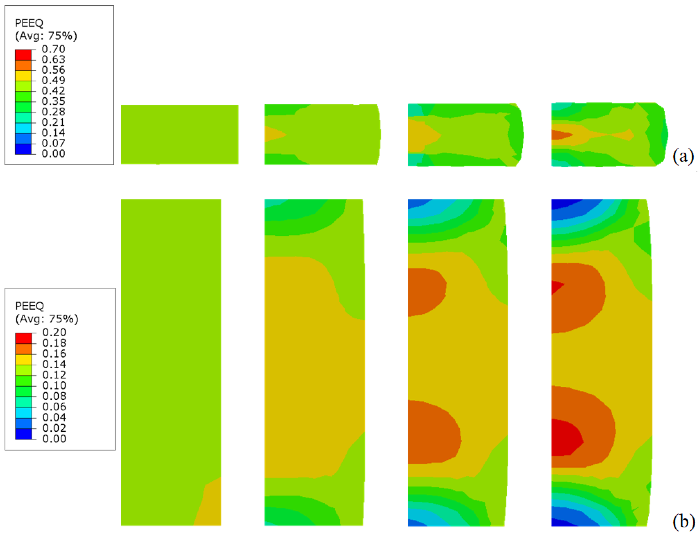 11]. Commonly used in metal forming analyses, this approach allows a more accurate calculation of interface conditions during compression. In the present study, the Avitzur method is applied to determine the friction coefficient based on the final shape of the specimen, ensuring that the observed barreling matches the mechanical behavior of the material.