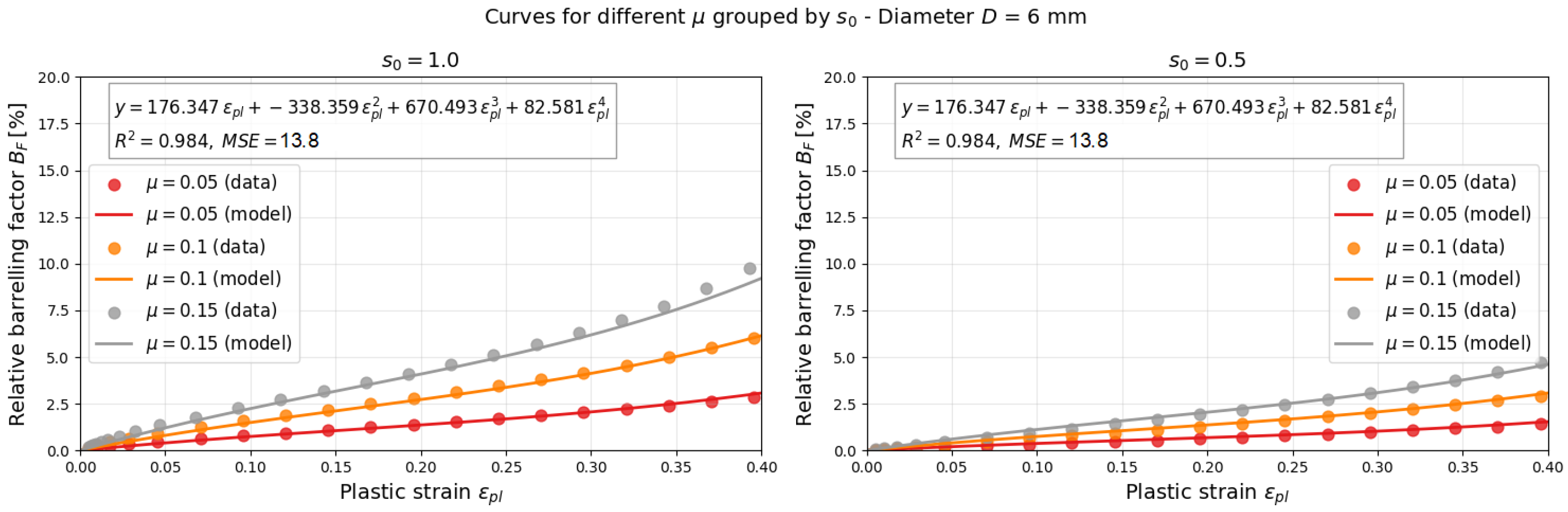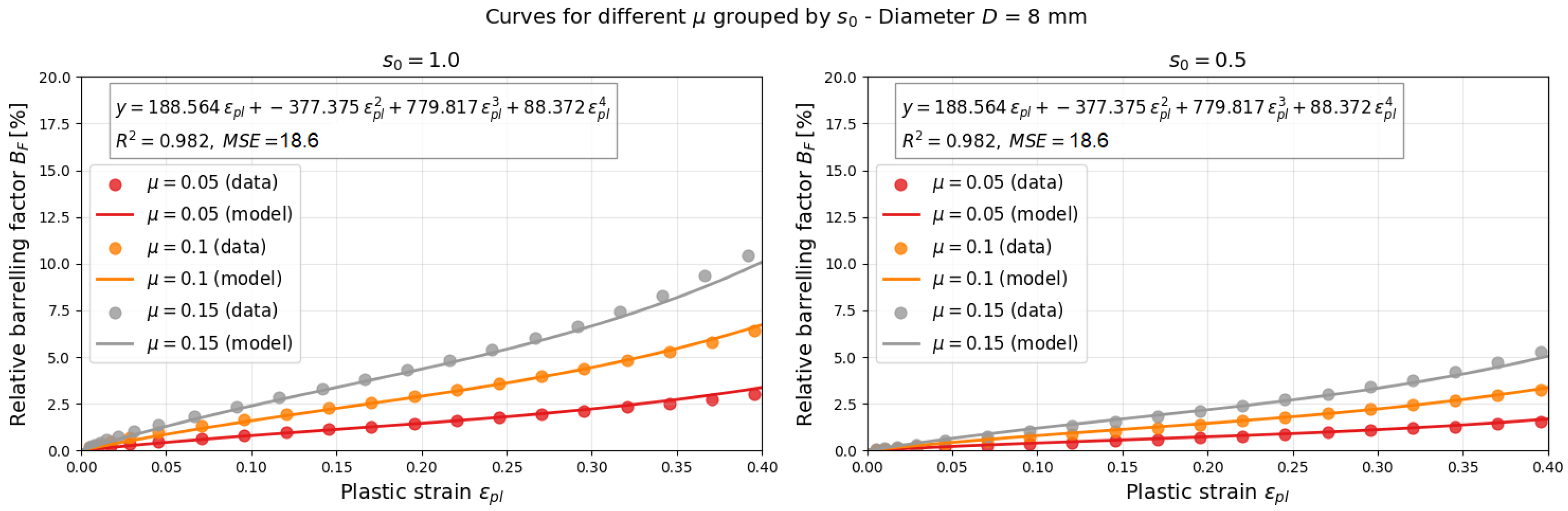 D = 6 mm and 8 mm. For both geometries, an increase in plastic strain leads to a progressive growth of the barreling factor, which becomes more pronounced at higher friction levels (