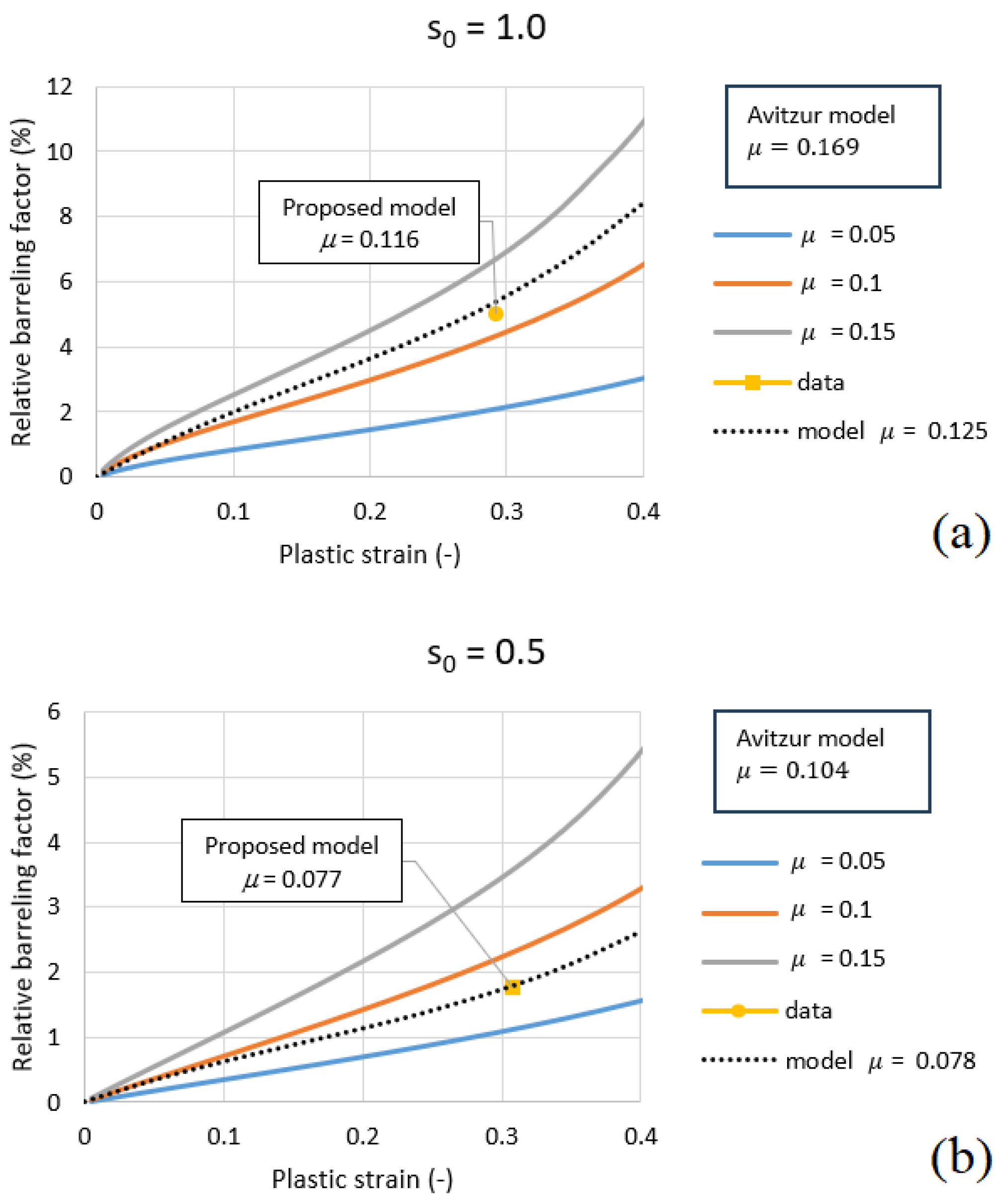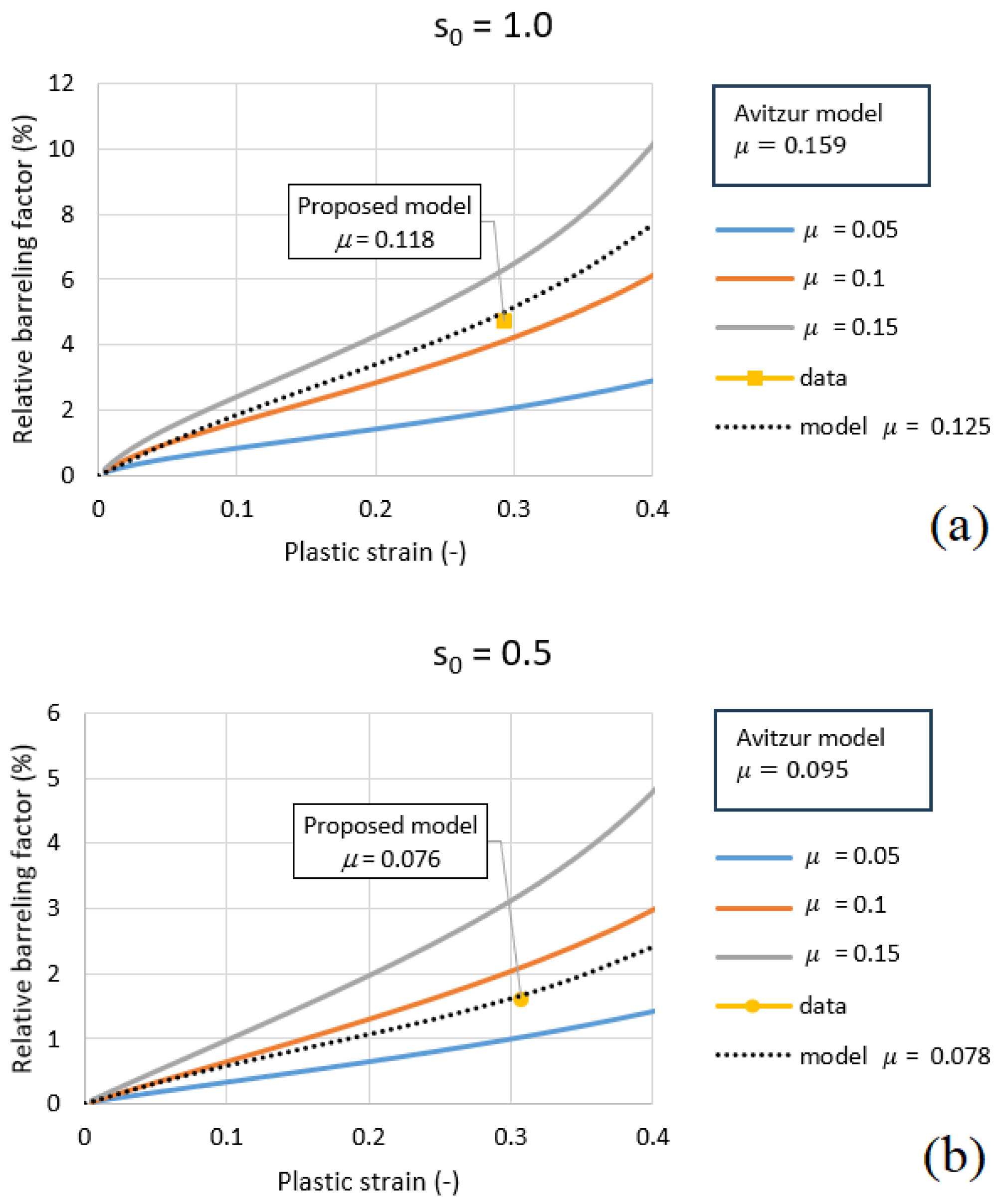 The newly proposed model complements this approach by enabling a more precise determination of the friction coefficient based on the observed specimen deformation, allowing for improved correction of the stress–strain response, minimization of barreling effects, and enhanced reliability of material characterization. This approach is compared with the model proposed by Avitzur to calculate the friction coefficient.