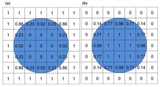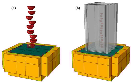 The assignment of material within the Eulerian element is achieved by the Eulerian volume fraction (EVF). EVF comes from the Boolean comparison between a Eulerian part instance and the reference part instance. The value of EVF ranges from 0 to 1, which depends on the occupied volume fraction between two instances. The volume fraction tool in ABAQUS allows operators to choose whether the occupied volume is assigned a value of 1 or 0 (Figure 2) []. In this work, the occupied volume is assigned with 1 (Figure 2b). The CEL method uses general contact based on the penalty function method to handle the contact between Lagrangian material and Eulerian material. It has the advantages of both Lagrangian analysis and Eulerian analysis, which can realize solid–liquid coupling precisely.