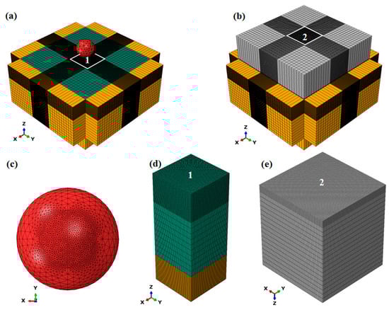 Element assignment for the models: (a) SP model, (b) WSP model, (c) close-up of mesh refinement in shot, (d) close-up of mesh refinement in region 1 of the (a) subfigure, (e) close-up of mesh refinement in region 2 of the (b) subfigure. Each color has the same meaning as described in the caption of Figure 3.