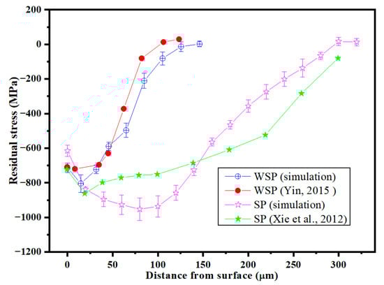 Following the simulation, five points were taken at each different depth of the target, and the average residual stress at each depth was calculated. Figure 6 presents both the simulation data and the corresponding experimental results. Despite variations in the specific values, the overall patterns and trends observed remain consistent across the data sets. Therefore, the model developed in this work is able to simulate the real SP and WSP processes.