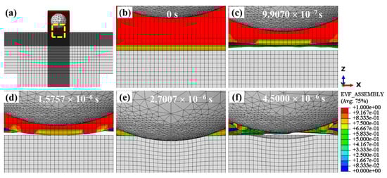 The water behavior of WSP-50 m/s is shown in Figure 7. Figure 7b–f are the enlarged views of the yellow dashed box in Figure 7a. The colorful part is water, and the gray parts are shot and target. At first, the mixture of shot and water runs to the target and touches its upper surface (Figure 7b). Later, as shown in Figure 7c, the water bounces back and separates from the upper surface. Then, the water is pushed by the shot, and impacts the upper surface again (Figure 7d). After that, as seen in Figure 7e, the shot strikes the upper surface and creates a dimple. Finally, the mixture of shot and water leaves the upper surface (Figure 7f). White gaps between water and surface in Figure 7c,d and Figure 7f indicate transient void zones caused by water rebound and flow separation during high-velocity impact. These voids occur because the single-shot WSP model uses a limited water supply, a condition that may not arise in actual WSP processes.