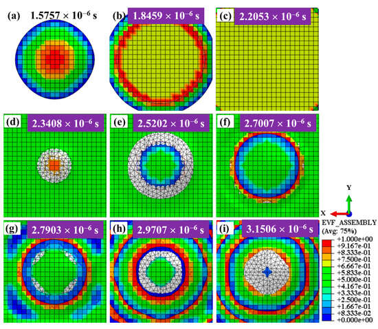 EVF evolutions of Eulerian meshes between the shot and the target are studied to search for the water film during WSP. Figure 8 shows the behavior of water between shot and target in three stages: approach (a–c), impact (d–f), and departure (g–i). It illustrates the EVF evolutions during the period of 1.5757 × 10−6~3.1506 × 10−6 s with an observation area of 0.22 × 0.22 mm2. At the time of 1.5757 × 10−6 s (Figure 8a), the water pushed by the shot hits the surface again with a circular contact area. Then, the circular contact area becomes larger (Figure 8b). Finally, the water covers the entire observation area (Figure 8c). Figure 8d–f show the EVF evolutions during the impact process between shot and target. The values of EVF are always not null, which proves the existence of water film. The size of water film increases with the increase in contact area between shot and target. Figure 8g–i show the EVF evolutions during the process of leaving.