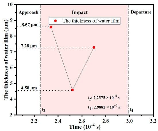 Since 0.6 mm (diameter of the shot) is much larger than 10 µm (mesh size), the surface of the shot is approximate to a flat surface within the area of a Eulerian element. Then, it is possible to calculate the thickness of water film (Figure 9). The thickness of water film changes with time and position. Water film thickness decreases as the impact contact area between the shot and target increases, and increases as the contact area decreases. At the time of 2.3408 × 10−6 s, 2.5202 × 10−6 s, and 2.7007 × 10−6 s, the thicknesses of the target center are 8.57 μm, 4.58 μm, and 7.28 μm, respectively.