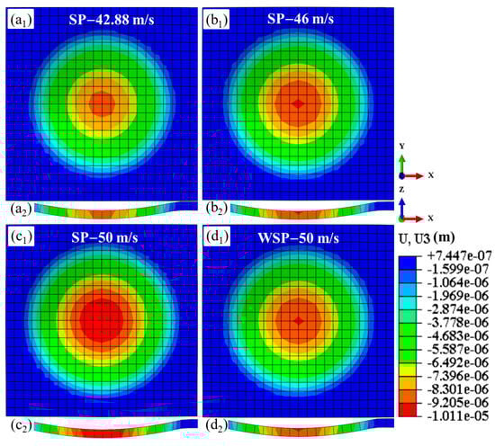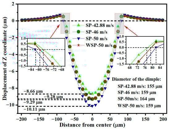 High-speed impact of shots on the target results in dimple formation and material extrusion around the dimple. This work focuses exclusively on counting and analyzing the dimple. The dimples created by four models are displayed in Figure 11. Figure 11a1–d1 are the surface topographies of SP-42.88 m/s, SP-46 m/s, SP-50 m/s, and WSP-50 m/s, respectively. Figure 11a2–d2 are the corresponding dimple contours past the dimple centers. The part where U3 is negative (inward concave) is the dimple. The location where U3 is null is the boundary of the dimple. It is easy to know that the dimples of SP-46 m/s and WSP-50 m/s are almost the same. The specific information of the dimples is visualized in Figure 12. With the SP velocity increases from 42.88 m/s to 46 m/s and 50 m/s, the dimple depth extends from 8.66 μm to 9.29 μm and 10.11 μm, and the dimple diameter raises from 154.99 μm to 158.52 μm and 163.64 μm. The depths and diameters of WSP-50 m/s and SP-46 m/s are similar, with the specific data of 9.28 μm, 158.87 μm and 9.29 μm, 158.52 μm, respectively. When compared to WSP-50 m/s with SP-46 m/s, the dimple depth is 0.01 µm shallower, while the dimple diameter is 0.35 µm larger. This means that WSP can obtain a larger diameter, even though the depth is shallower than that created by SP. WSP-50 m/s and SP-50 m/s have the same initial velocity, while the dimple depth and dimple diameter of WSP-50 m/s are 0.83 µm shallower and 4.77 µm smaller. So, treating WSP as SP is inaccurate, and ignores the water’s role.