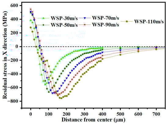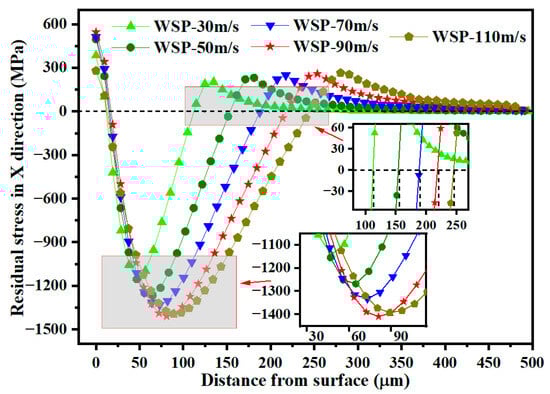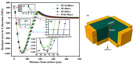 This paper analyzes the residual stress distributions in the depth direction and the radial direction of dimples. The residual stresses mentioned in the paper are stresses in the x-axis direction. The locations of the residual stress selected in the depth direction are shown in Figure 13e. All the residual stress curves are spoon-shaped (Figure 13). With the increase in depth, the residual stress shows a tensile stress state, a compressive stress state, and a tensile stress state, respectively. And finally, the residual stress tends to be zero. The specific values of residual surface stress (σRS1), tensile stress layer depth (D1), maximum residual stress (σRS2), maximum residual stress depth (D2), and compressive residual stress layer depth (D3) in the depth direction of the target center for the four models are shown in Table 5. When the velocity increases from 42.88 m/s to 46 m/s and 50 m/s, σRS1, D1, σRS2, D2, and D3 are all increased. Because WSP-50 m/s and SP-46 m/s have similar dimple sizes, comparing the residual stresses generated by the two models is essential and meaningful. When compared to WSP-50 m/s with SP-46 m/s, σRS1 and D1 are 13.89% smaller and 4.19% thinner, respectively, while σRS2, D2, and D3 are almost the same.