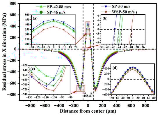 The residual stress distributions in the radial direction of four models are displayed in Figure 14. The locations of the residual stress selected in the radial direction on the upper surface of the target are shown in Figure 13e. The four models’ residual stress curves have a “W” shape, which are symmetrical about the dimple centers. The residual stress is in a tensile state near the dimple center. When the distance from the dimple center increases, the tensile residual stress decreases and changes to compressive residual stress. Then, the compressive residual stress continues to increase and reaches its maximum at the protrusion outside the dimple, and after that, the compressive residual stress starts to decrease to zero. Industrial application of the SP process usually needs to ensure that the SP coverage is greater than 100% (more than 98% actual coverage can be considered as 100%), so the residual stress distribution in the dimple area is meant for application. The residual stress curves between the two vertical dashed lines shown in Figure 14 are the residual stress distributions in the radial direction of dimples, which are enlarged in Figure 14d. The residual stress is in a tensile state near the dimple center, while it is in a compressive state around the dimple’s edge. In the dimple’s radial direction, the maximum tensile residual stress (σRS3), the area of tensile residual stress (LTRS) (measured by the length of the tensile residual stress area), the maximum compressive residual stress (σRS4), the area of compressive residual stress (LCRS) (measured by the length of the compressive residual stress area), and the percentage of compressive residual stress (PCRS) (measured by LCRS/(LCRS + LTRS)) are listed in Table 6. Compared WSP-50 m/s with SP-46 m/s, σRS4, LCRS, and PCRS are 5.4% bigger, 12.43% larger, and 12.17% higher, while σRS3 and LTRS are both smaller with varying degrees. For evaluating the residual stress distribution, the standard deviation is solved for the residual stress. The standard deviations for the residual stresses of SP-42.88 m/s, SP-46 m/s, SP-50 m/s, and WSP-50 m/s are 304.56 MPa, 304.51 MPa, 298.48 MPa, and 286.59 MPa, respectively. The standard deviation of WSP is smaller than that of SP, which means the residual stress distribution of WSP is more uniform than that of SP.
